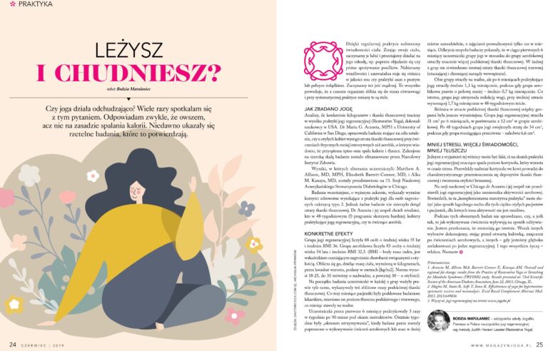 1. Araneta M, Allison MA, Barrett-Connor E, Kanaya AM. Overall and regional fat change: results from the Practice of Restorative Yoga or Stretching for Metabolic Syndrome (PRYSMS) study. Results presented at: 73rd Scientific Session of the American Diabetes Association; June 22, 2013; Chicago, IL.2. Hagins M, States R, Selfe T, Innes K. Effectiveness of yoga for hypertension: systematic review and metanalysis. Evid Based Complement Alternat Med. 2013. 2013:6498363. Więcej nt. jogi regeneracyjnej na stronie https://jogabo.pl/o-jodze/joga-regeneracyjna/