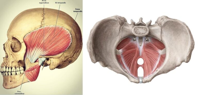 Połączenie obszarów dna miednicy z narządem żucia wydaje się totalną abstrakcją. Jednak w praktyce terapii manualnej i osteopatii połączenia te nie są niczym nadzwyczajnym. Stanowią anatomiczny szlak zaburzeń czynnościowych. Wykorzystuje się je w terapii jako dostęp do zabodźcowania organizmu w celu samoregulacji i samoleczenia. Dodatkowo, takie mechanizmy wzmożonego napięcia mięśni mogą wędrować w obu kierunkach.
