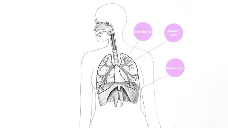 Przepona to główny mięsień oddechowy. Jej skurcz powoduje, że powietrze wdychamy. Powietrze przechodzi przez oskrzeliki i trafia do pęcherzyków płucnych, w których zachodzi wymiana gazowa. Po niej następuje wydech.