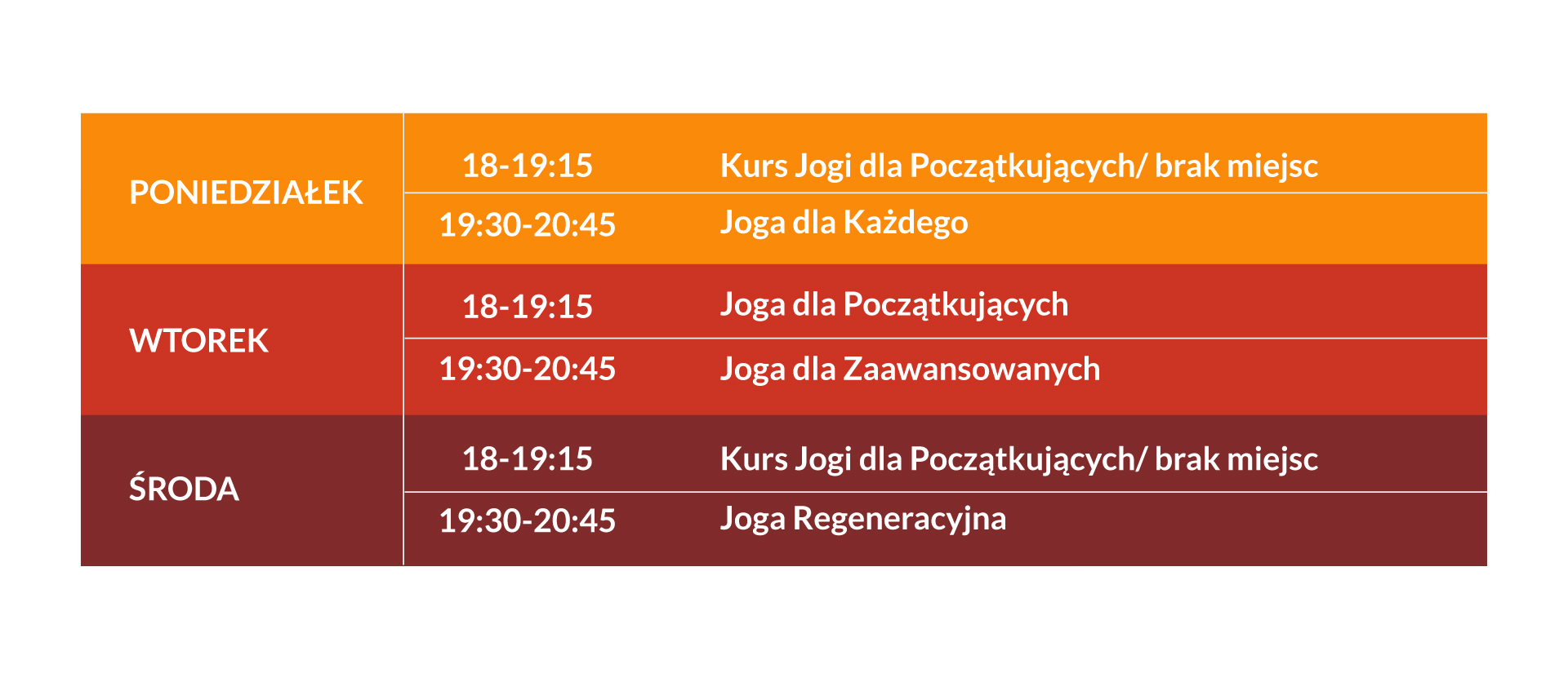 Joga dla Każdego – otwarta dla wszystkich chętnych, bez względu na długość praktyki; sekwencja asan każdorazowo dopasowywana jest do zebranych osób